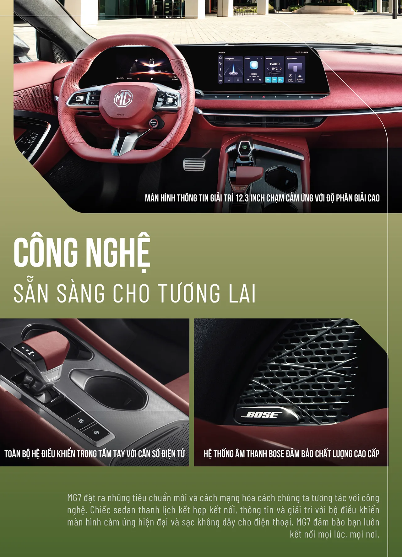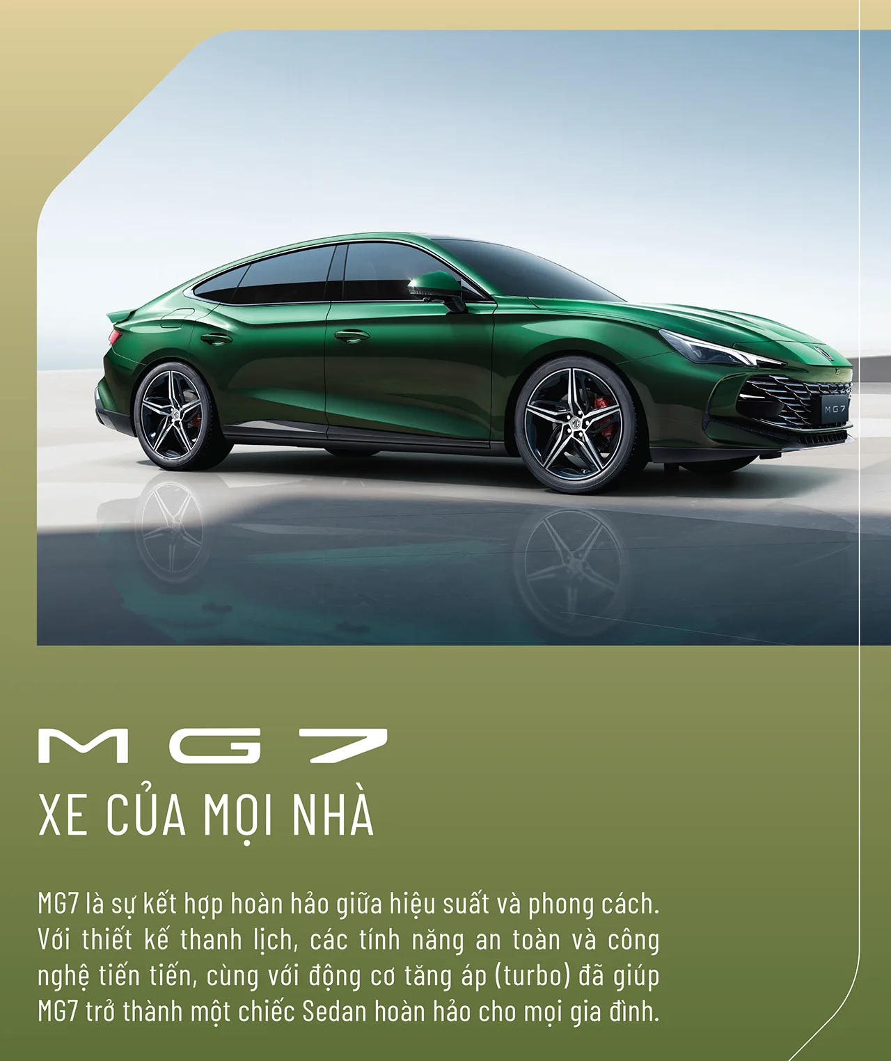 MG7 nổi bật với thiết kế ngoại thất thanh lịch, nội thất hiện đại và trang bị khối động cơ mạnh mẽ cùng hộp số mượt mà. MG7 mang đến những tiện ích vượt mong đợi và nổi bật trong phân khúc D sedan. MG7 là mảnh ghép hoàng hảo cho cuộc sống hiện đại.