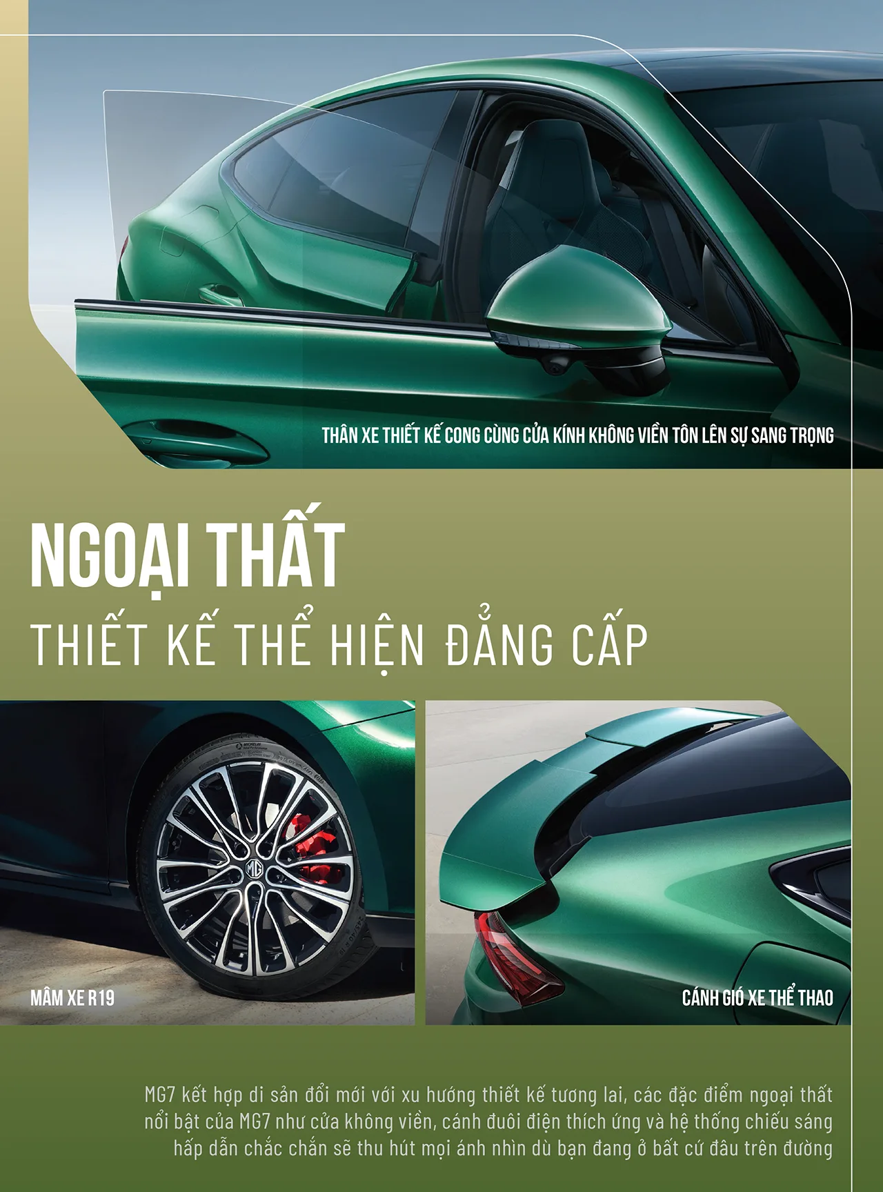 MG7 kết hợp di sản đổi mới với xu hướng thiết kế tương lai, các đặc điểm ngoại thất nổi bật của MG7 như cửa không viền, cánh đuôi điện thích ứng và hệ thống chiếu sáng hấp dẫn chắc chắn sẽ thu hút mọi ánh nhìn dù bạn đang ở bất cứ đâu trên đường.